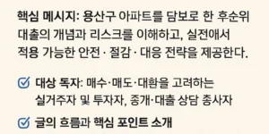 용산구 아파트 담보의 숨은 함정 — 후순위 대출 전략 가이드(아웃라인) 개요(포스트 목적) 핵심 메시지: 용산구 아파트를 담보로 한 후순위 대출의 개념과 리스크를 이해하고, 실전에서 적용 가능한 안전·절감·대응 전략을 제공한다. 대상 …